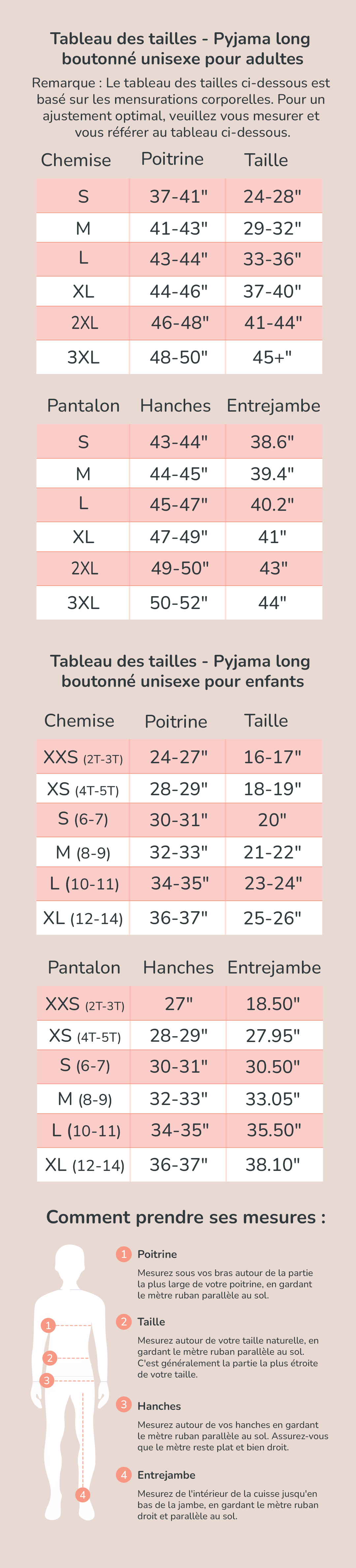 - Adultes: S, M, L, XL, 2XL, 3XL